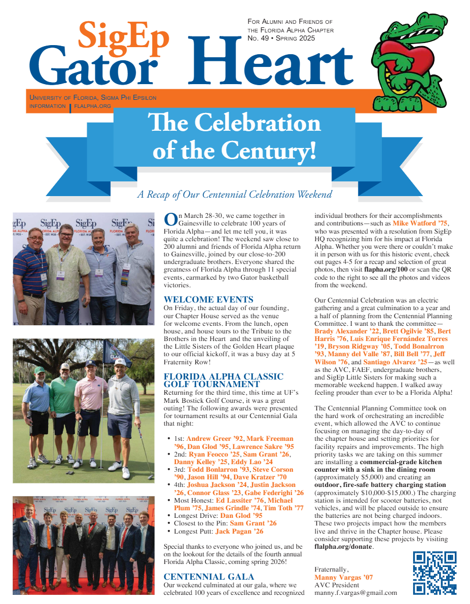 The Gator Heart is the official Florida Alpha Alumni Newsletter, published every Spring and Fall, which includes news, updates , and stories from the alumni and undergraduate brothers.